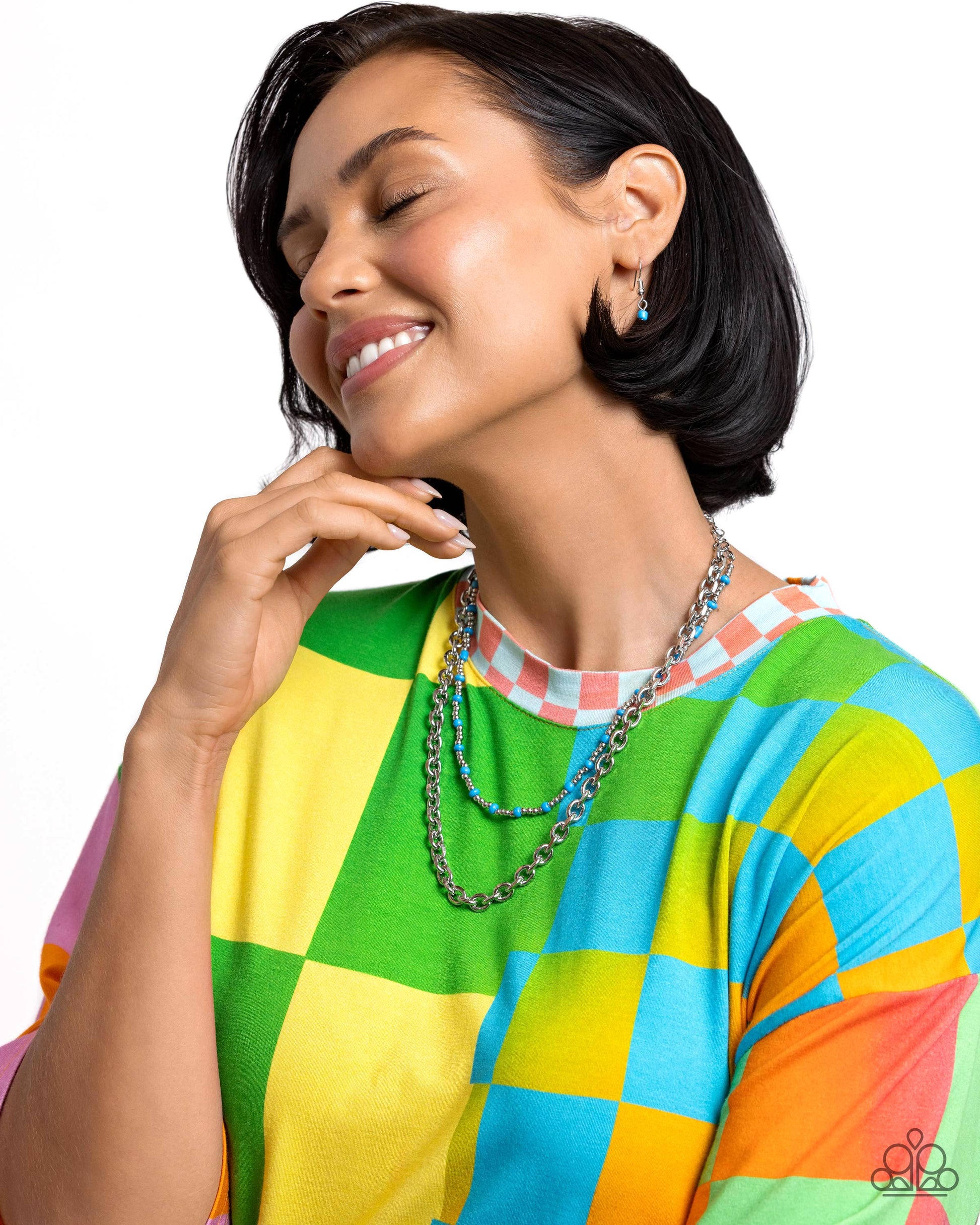 Layered beside a bold silver chain, dainty silver and blue beads are threaded along an invisible wire below the collar, resulting in a colorfully layered design. Features an adjustable clasp closure.