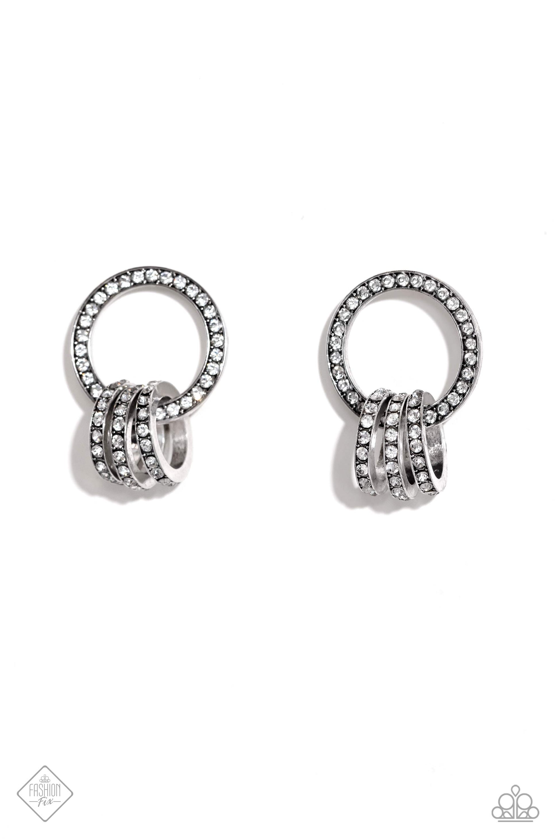 A commanding collection of silver hoops, adorned in glitzy white rhinestones, coalesces into an interlocking hoop display, creating a brilliantly stacked lure. The larger hoop the three smaller hoops adorn is also framed in glitzy white rhinestones, emitting glitz and glam from every curve. Earring attaches to a standard post fitting.