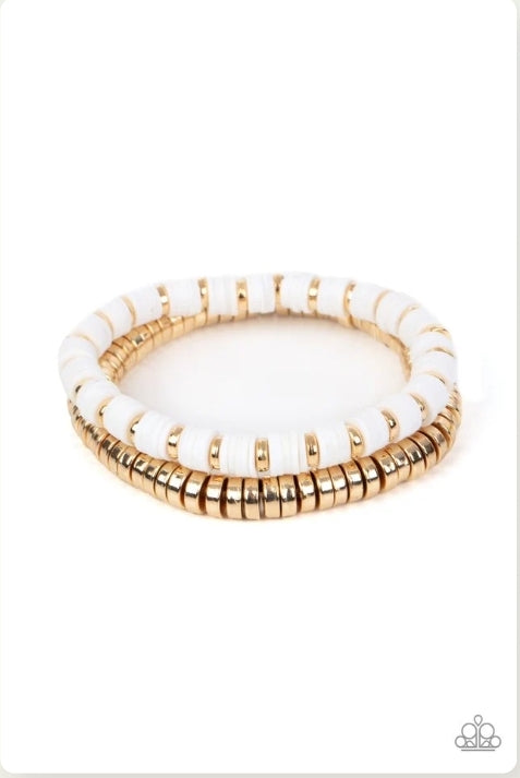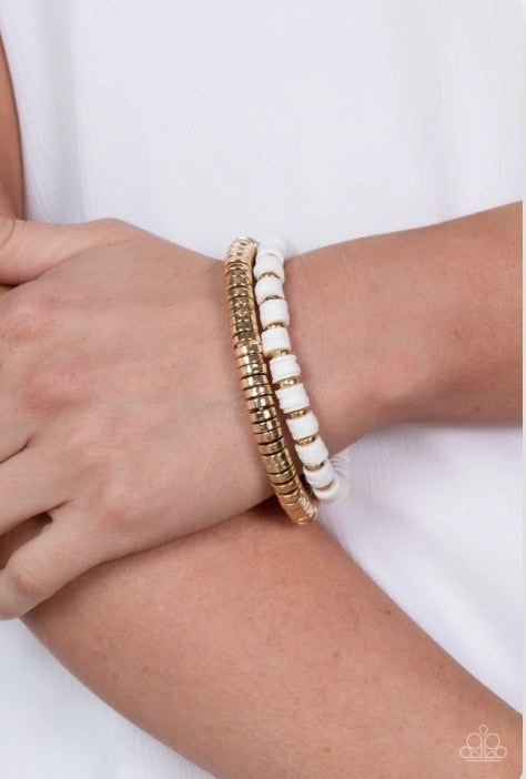 Infused with stretchy bands, a row of gold disc beads joins a strand of rubbery white and gold discs around the wrist, resulting in a modern duo.