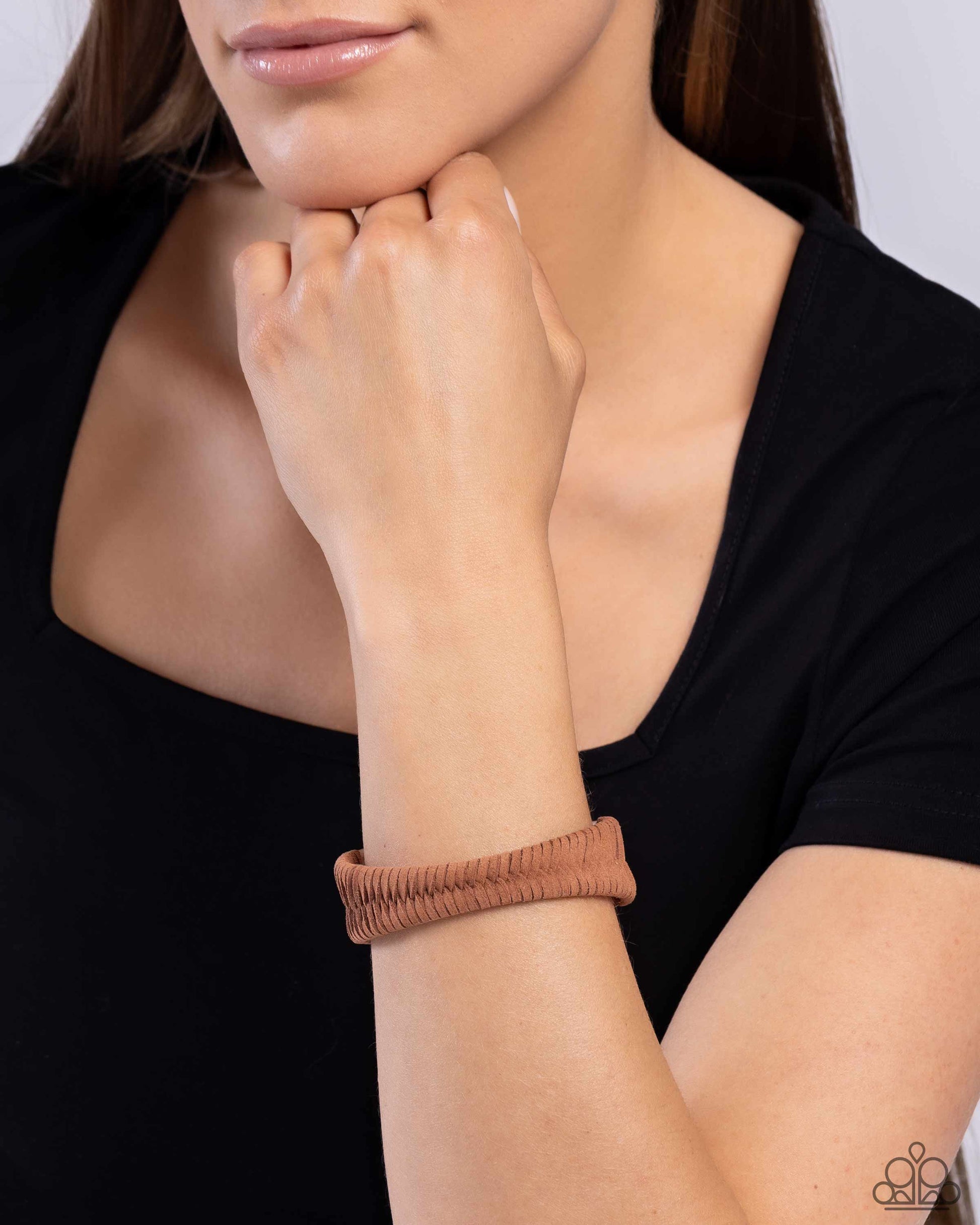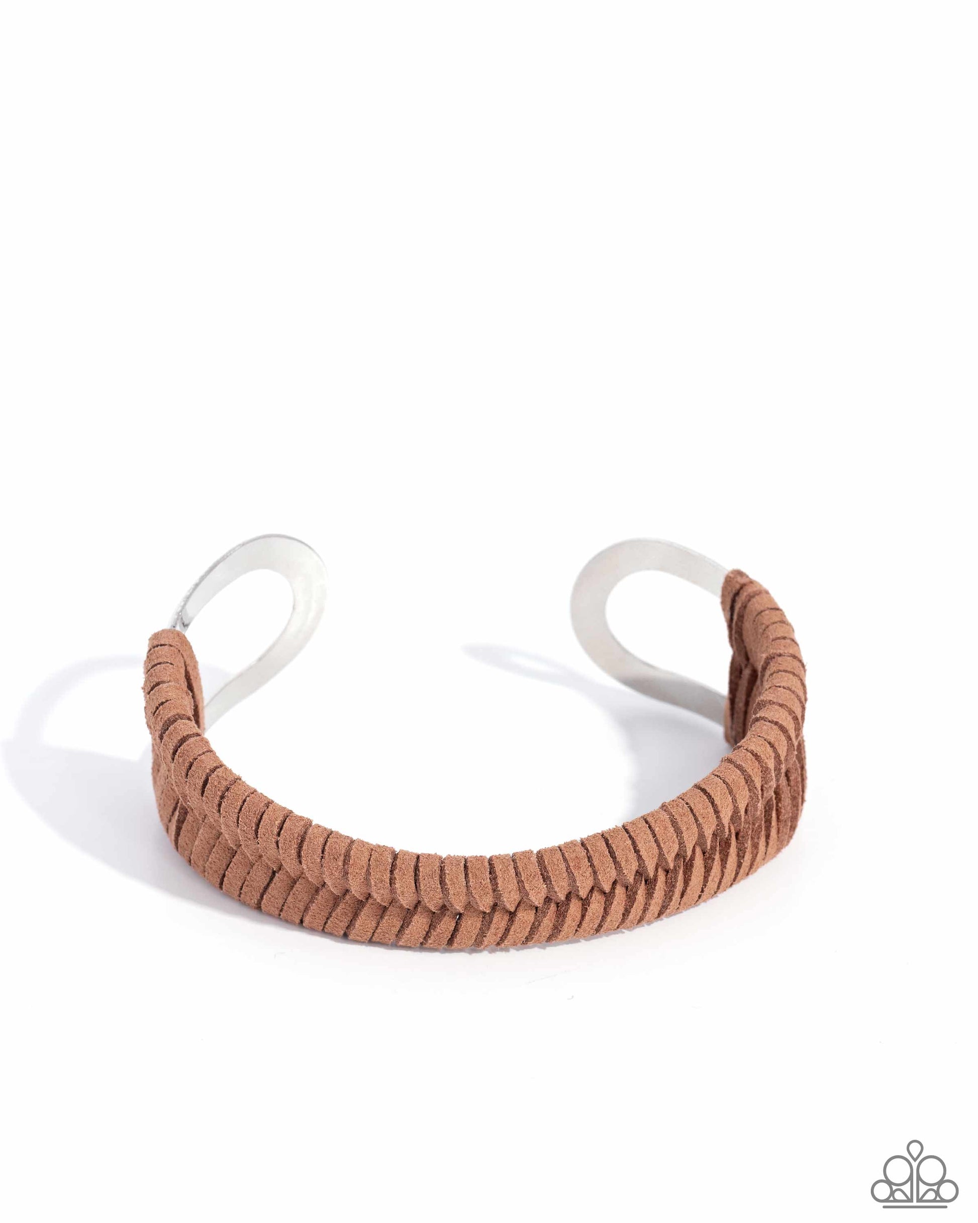 Brown suede laces intricately weave around an oversized silver cuff around the wrist, resulting in an earthy and versatile centerpiece.