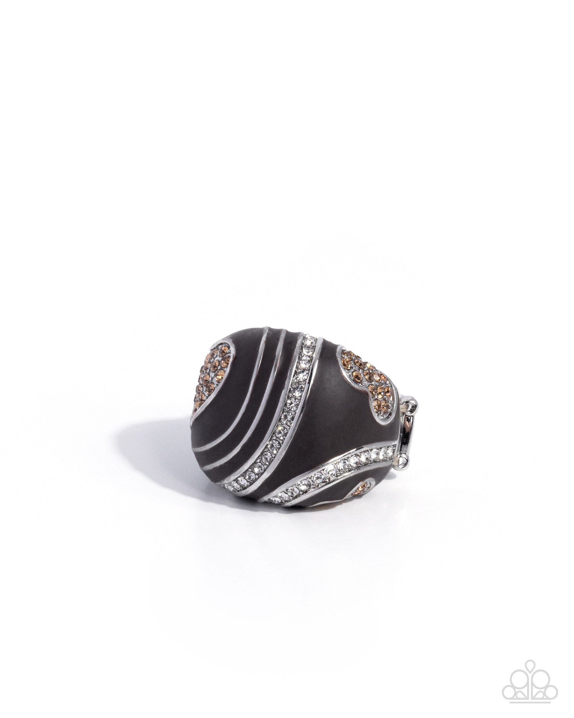 Featuring light-colored topaz rhinestone-embellished silver hearts, a brown-painted striped canvas, sporadically interrupted by rows of white rhinestones, coalesces into an audaciously abstract display atop the finger. Features a stretchy band for a flexible fit.