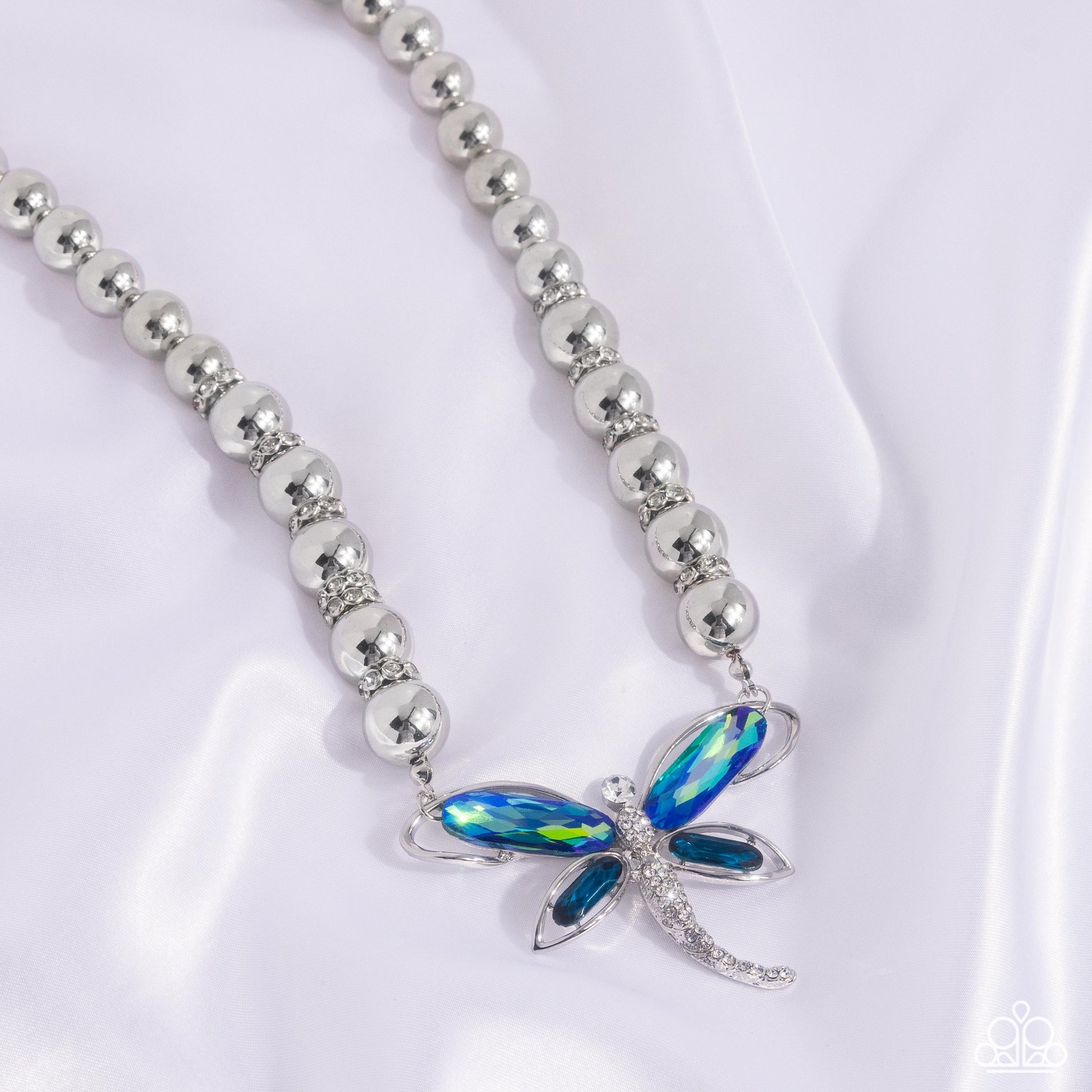 Embellished in white rhinestones, silver floral ornaments alternate with glossy silver beads on an invisible string below the neckline. A three-dimensional silver dragonfly pendant with a white gem head, a body of white rhinestones, UV-splashed blue and green upper wings, and blue oval lower wings flutters atop airy silver wings, connecting to the beaded display for a whimsically wondrous centerpiece. Features an adjustable clasp closure.