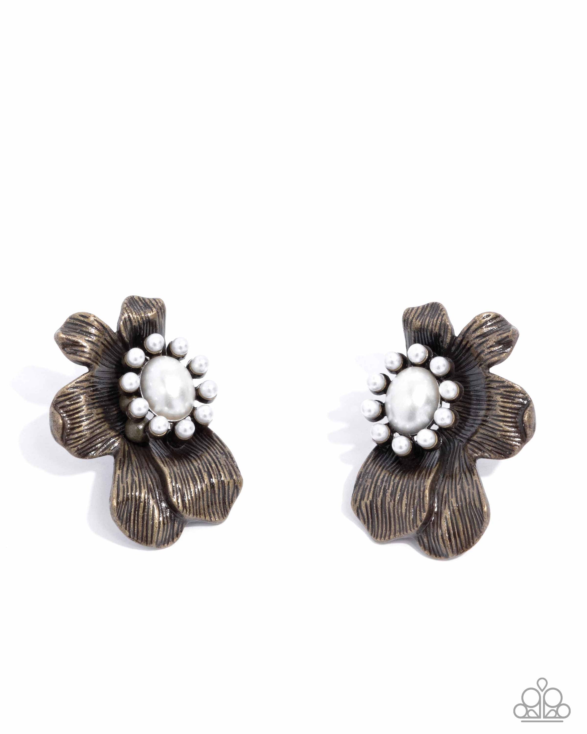Textured brass petals bloom from a white pearl floral center, layering into a radiantly rustic half-blossom for a whimsical flair. Earring attaches to a standard post fitting.