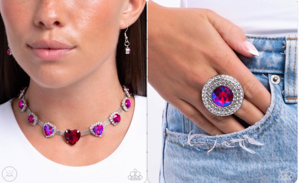 Featuring white rhinestone borders, a collection of silver-pronged fuchsia and fuchsia UV round gems alternate and lead the eye to dramatic fuchsia UV-shimmery heart-shaped gems that glitter along rows of dainty abstract silver chains. An oversized, faceted fuchsia heart gem in pronged silver fittings is featured at the center of the design, resulting in a flirtatious sparkle around the neck. Features an adjustable clasp closure.