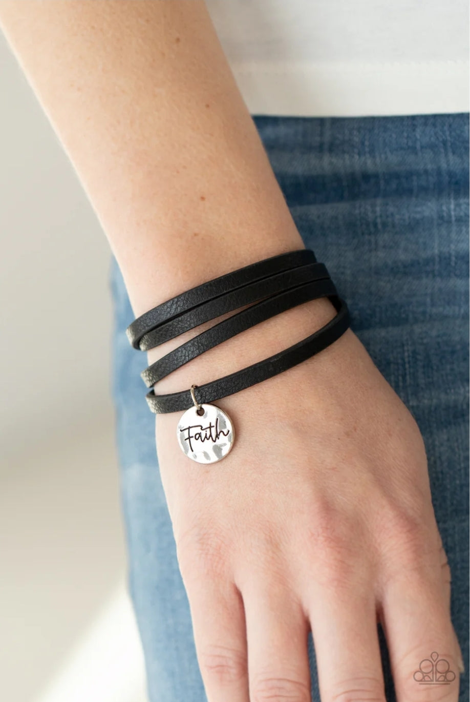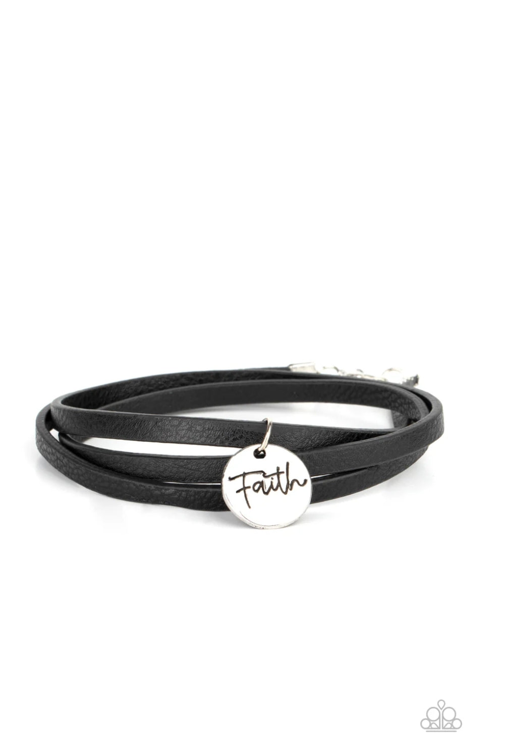 A hammered silver disc stamped in the word, "Faith" is threaded on a lengthened black leather cord that triple wraps around the wrist, creating a message of hope. Features an adjustable clasp closure.