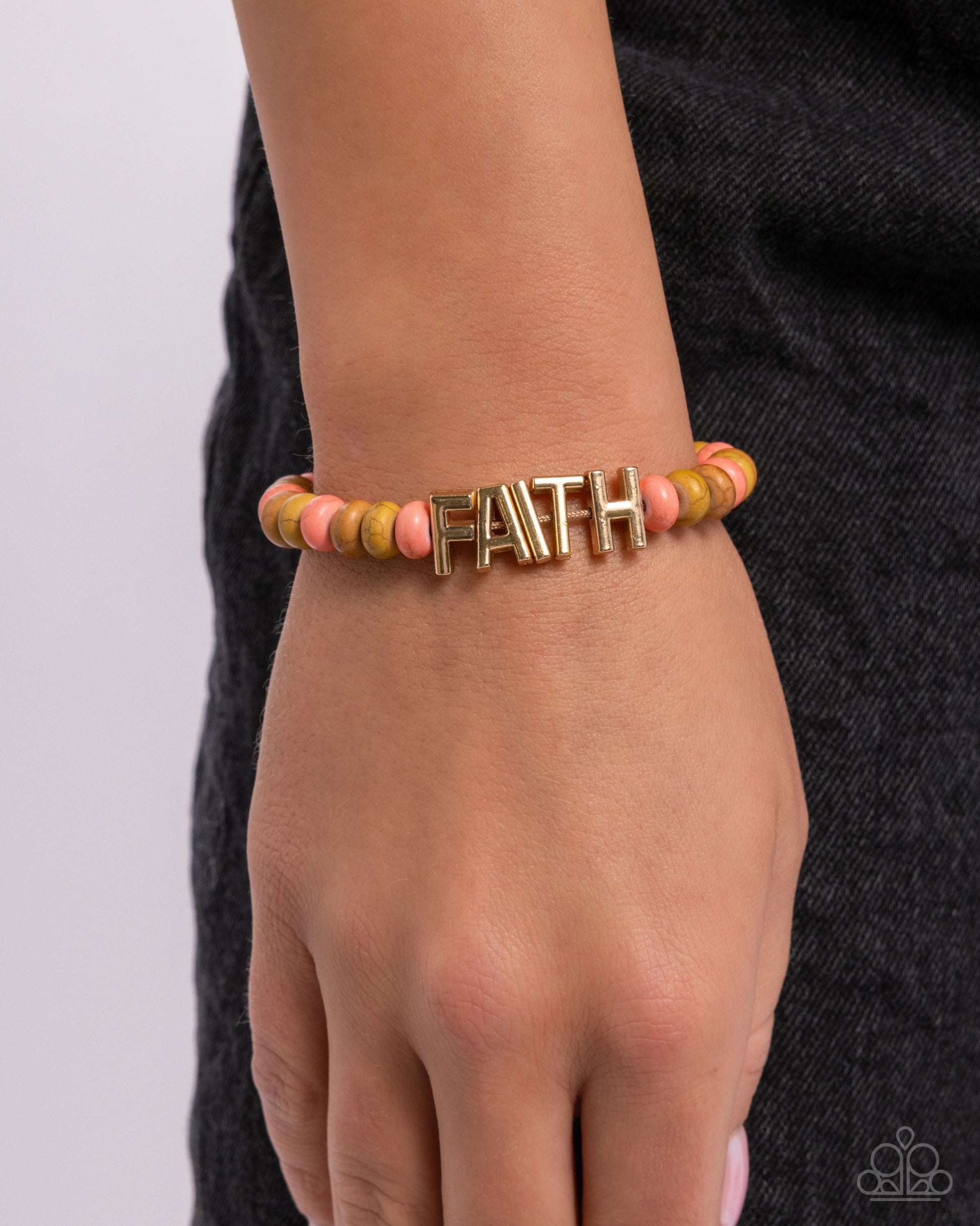 Smooth Golden Palm, Desert Rose, and Buckthorn stone beads are strung along a knotted cord, leading to bold gold letters spelling "FAITH" at the center. The natural stone beads add a grounded, earthy feel to the design. The adjustable cord allows for easy wear. As the stone elements in this piece are natural, some color variation is normal.